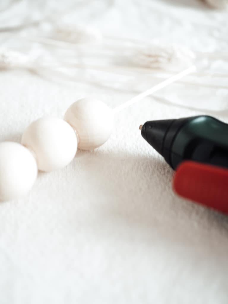 Nimm dir das Holzstäbchen und lege die erste Kugel darauf. Dann kannst du ein wenige ( !) Heißkleber um das Loch herum kleben und die nächste Kugel direkt darüber ankleben. Das Holzstäbchen sorgt dafür, dass alle Löcher passend übereinander liegen.