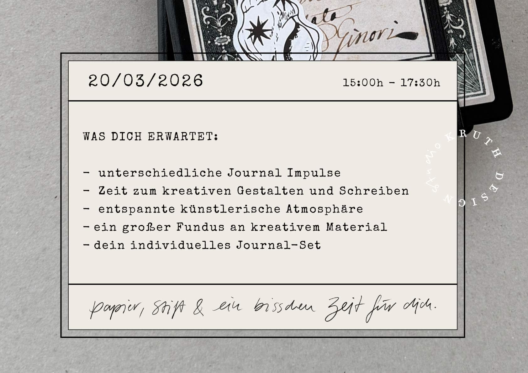 In diesem 2,5-stündigen Workshop bekommst du viele unterschiedliche Impulse rund um das Thema Stift und Papier. Du brauchst keine Vorerfahrung und kein künstlerisches Talent, nur ein bisschen Neugier auf eine kreative Auszeit. Wir gestalten gemeinsam die ersten Seiten deines neuen Journals, schauen uns ein paar Layout-Techniken und Essentials an und du darfst aus dem vollen „Kruth Design Kreativfundus“ schöpfen in entspannter, kreativer Atmosphäre.