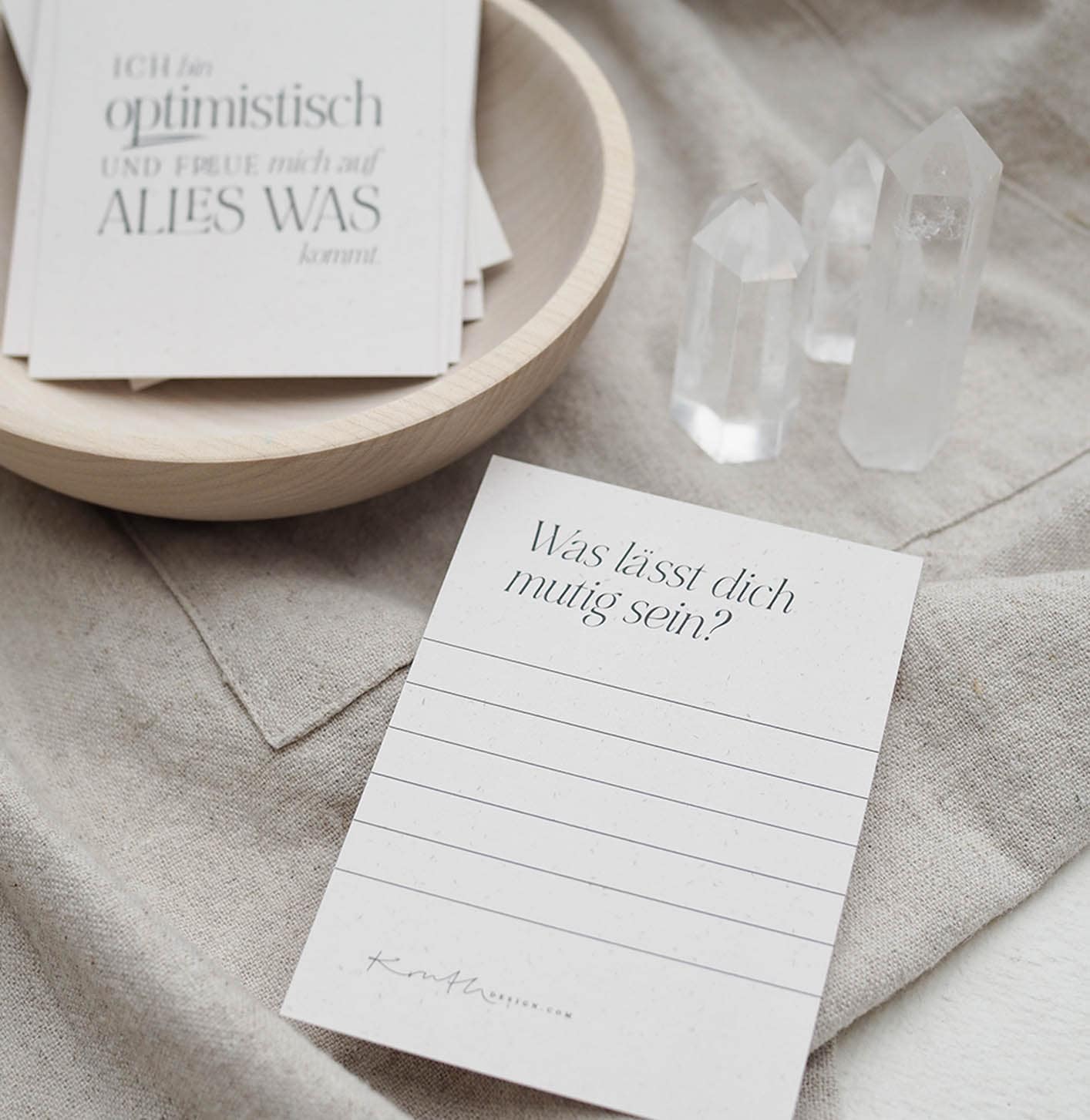 Die Karten sind komplett auf deutsch verfasst. Auf der Rückseite findest Du zu jedem Statement eine passende Frage und Platz, Deine Antworten schriftlich auf ihr festzuhalten. So kannst Du Dich noch mehr reflektieren und hast einen noch achtsameren Blick auf die Affirmation.